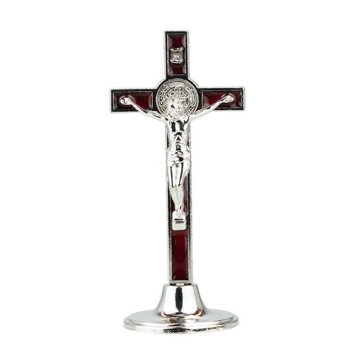 Crucifixo prateado com detalhes na cor vermelha de 12 cm de altura.