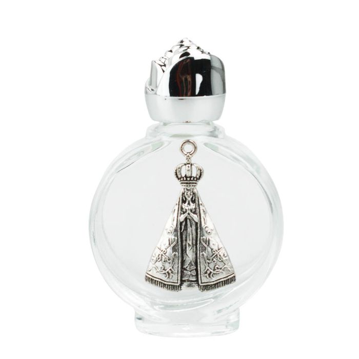 Mini frasco de 7 x 4,5 cm de dimensão, no formato de Nossa Senhora Aparecida.
