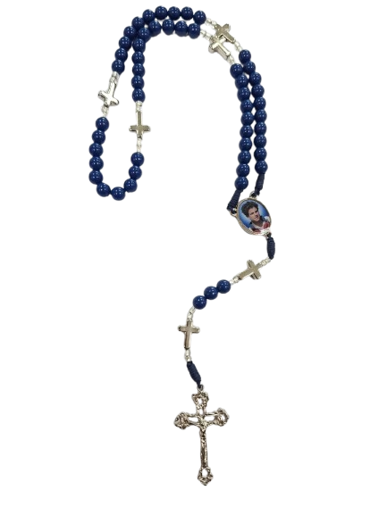 contas 7mm nas cores azul entremeio medalha resinada Carlo Acutis no cordão.