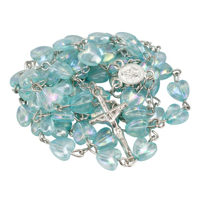 Terço com contas 1cm na cor azul, com formato de coração.