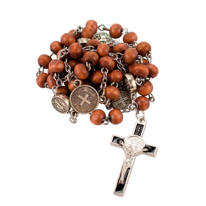 Terço de São bento contas 0,7cm em madeira corrente metal prateada
