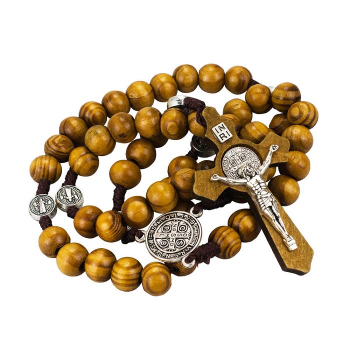 Terço no cordão contas em madeira com medalhas São Bento.